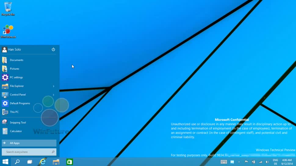 Wenn man Windows 9 "Threshold" in der Technical Preview installiert, wird zumindest in der vorliegenden Build 9834 per Standardeinstellung anstelle des weiterhin vorhandenen Startscreens von Windows 8 das neue Startmenü angezeigt, wenn man auf den Start-Button klickt. Dabei werden grundsätzlich einige Live-Tiles neben der aus Windows 7 bekannten Liste von Programmen angezeigt.